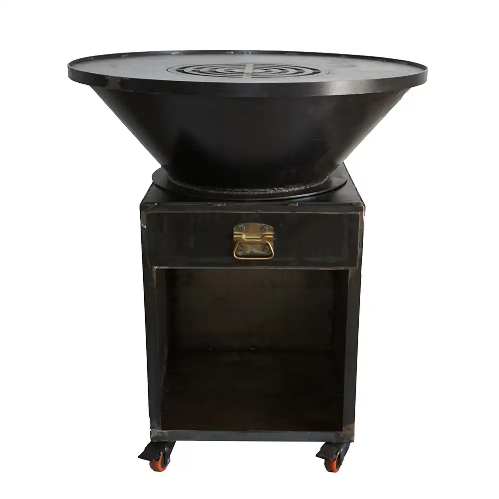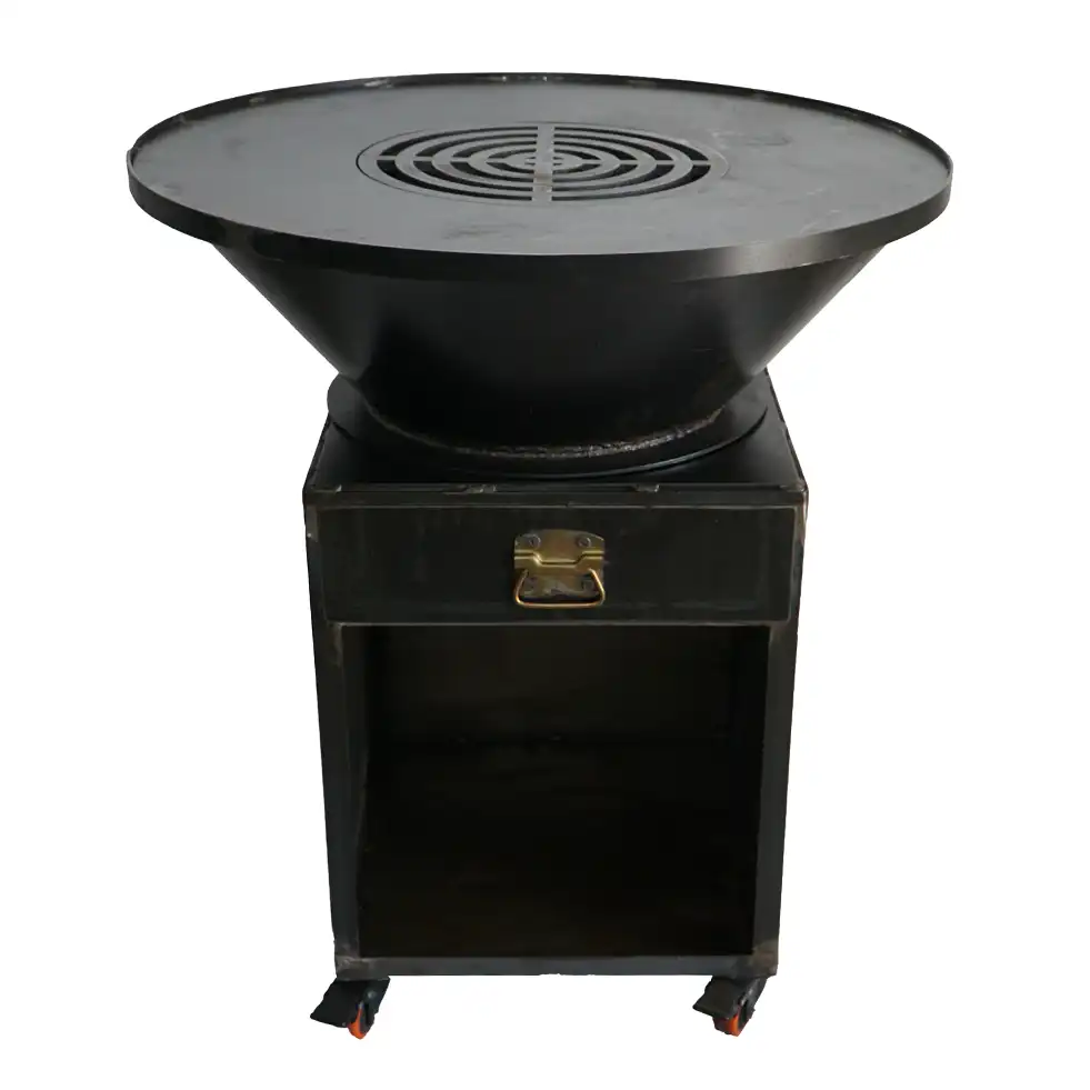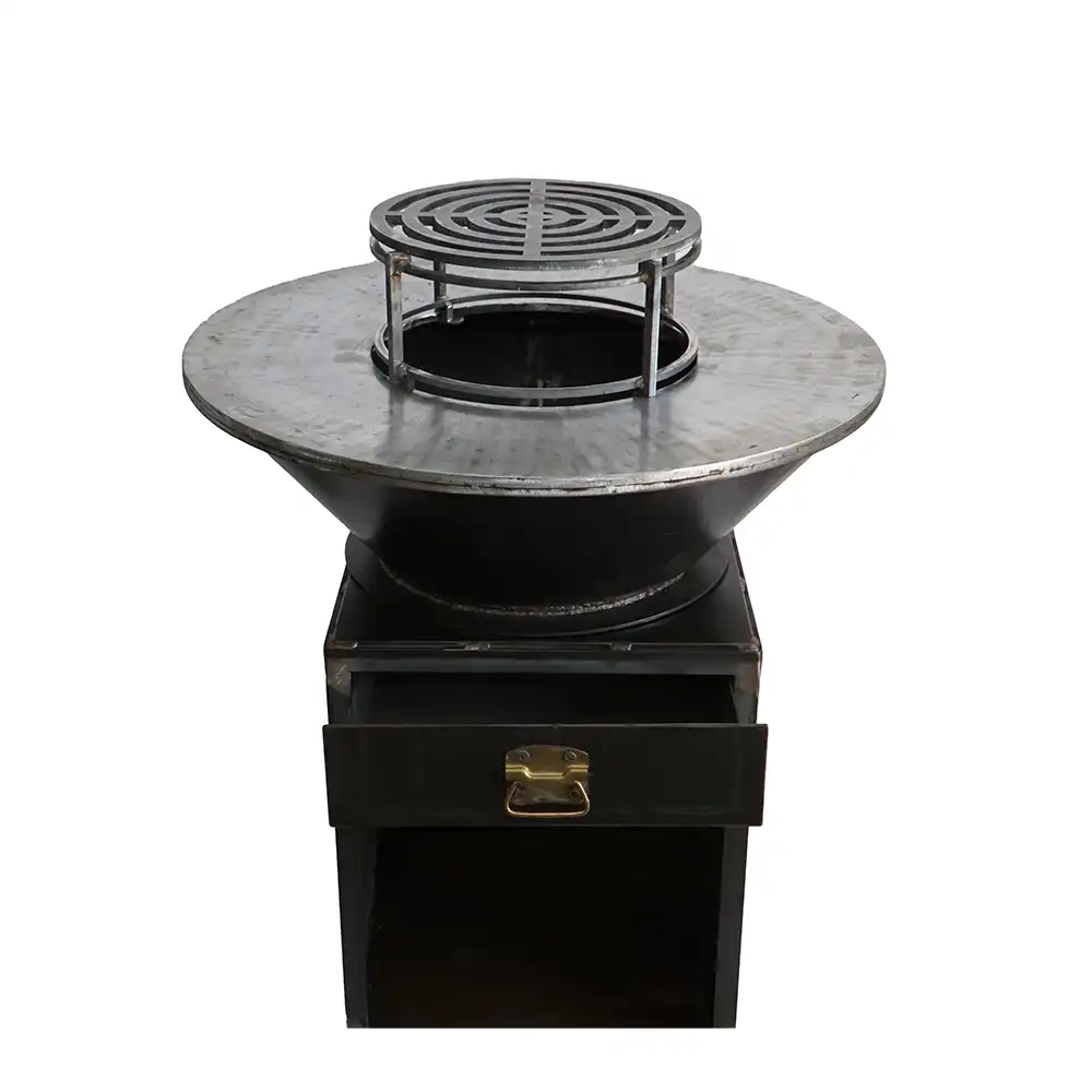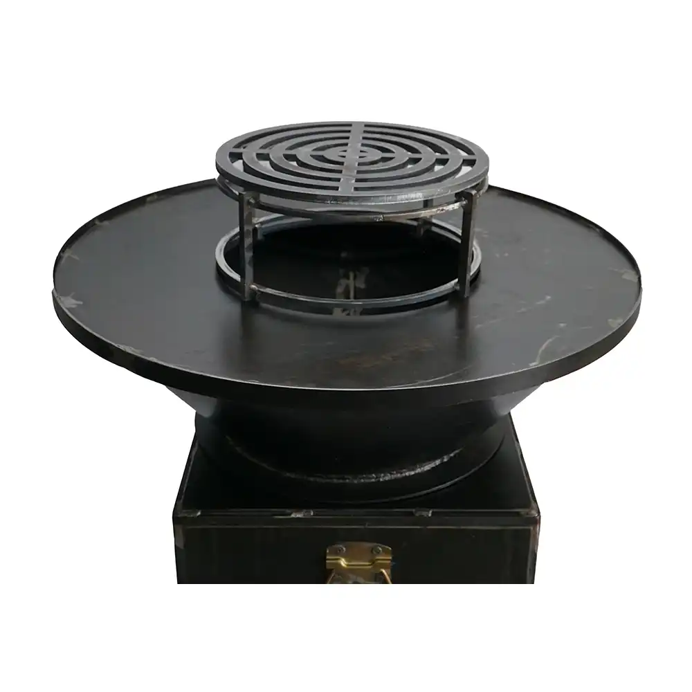 - Baza este realizată din oțel de 3 mm grosime, garantează stabilitate și servește ca aport de aer facand ca aprinderea focului sa fie foarte usoara si arderea lemnului sa fie eficienta cu minim de fum rezultat.